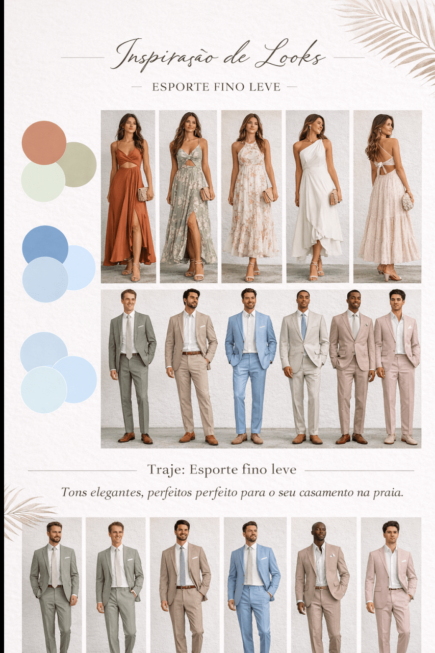 Nosso casamento será na praia, durante a tarde, então sugerimos um visual elegante e leve.